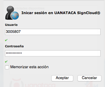 La aplicación muestra una ventana donde debes introducir las credenciales identificativas “Usuario” y “Contraseña” asociados a tu certificado digital remoto.